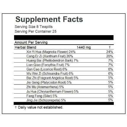 Xin Yi Hua (Magnolia Flower) Magnolia spp.; Flos 24.00% Cang Er Zi (Xanthium Fruit) Xanthium sibiricum; Fructus 20.00% Lian Qiao (Forsythia Fruit) Forsythia suspensa; Fructus 7.00% Huang Bai (Phellodendron Bark) Phellodendron spp.; Cortex 7.00% Wu Wei Zi (Schisandra Fruit) Schisandra chinensis; Fructus 6.00% Gan Cao (Licorice Root) Glycyrrhiza spp.; Radix 6.00% Fang Feng (Siler) Saposhnikovia divaricata; Radix 5.00% Jie Geng (Platycodon Root) Platycodon grandiflorum; Radix 5.00% Ju Hua (Chrysanthemum Flower) Chrysanthemum morifolium; Flos 5.00% Bai Zhi (Fragrant Angelica Root) Angelica dahurica; Radix 5.00% Jing Jie (Schizonepeta) Schizonepeta tenuifolia; Herba 5.00% Zhi Mu (Anemarrhena) Anemarrhena asphodeloides; Rh. 5.00%