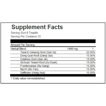 San Qi / Tian Qi (Notoginseng) Panax notoginseng; Radix 20.00% Xu Duan (Sichuan Teasel Root) Dipsacus asper; Radix 15.00% Xue Jie (Dragon's Blood) Calamus draco; Resina 15.00% Dang Gui (Chinese Angelica Root) Angelica sinensis; Radix 15.00% Ru Xiang (Frankincense) Boswellia carterii; Resina 15.00% Mo Yao (Myrrh) Commiphora myrrha 10.00% Hong Hua (Safflower) Carthamus tinctorius; Flos 10.00%