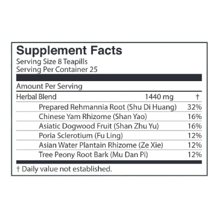 Di Huang -shu (Rehmannia Root (Prepared)) Rehmannia glutinosa; Radix Praep. 32.00% Shan Zhu Yu (Asiatic Dogwood Fruit) Cornus officinalis; Fructus 16.00% Huai Shan / Shan Yao (Chinese Yam) Dioscorea oppositiflora; Radix 16.00% Fu Ling (Poria; Hoelen; Tuckahoe) Poria cocos; Sclerotium 12.00% Mu Dan Pi (Tree Peony Root Bark) Paeonia suffruticosa; Cortex 12.00% Ze Xie (Asian Water Plantain Rhizome) Alismatis orientalis; Rhizoma 12.00%