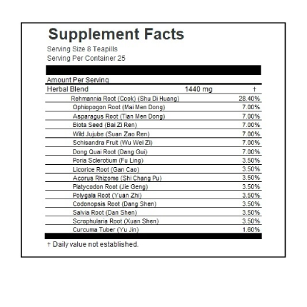 Di Huang -shu (Rehmannia Root (Prepared)) Rehmannia glutinosa; Radix Praep. 28.40% Suan Zao Ren (Jujube) Ziziphus jujuba spinosa; Semen 7.00% Mai Men Dong (Ophiopogon Root Tuber) Ophiopogon japonicus; Radix 7.00% Wu Wei Zi (Schisandra Fruit) Schisandra chinensis; Fructus 7.00% Tian Men Dong (Chinese Asparagus Root) Asparagus cochinchinensis; Radix 7.00% Bai Zi Ren Platycladus orientalis; Semen 7.00% Dang Gui (Chinese Angelica Root) Angelica sinensis; Radix 7.00% Jie Geng (Platycodon Root) Platycodon grandiflorum; Radix 3.50% Dan Shen (Chinese Salvia Root) Salvia miltiorrhiza; Radix 3.50% Fu Ling (Poria; Hoelen; Tuckahoe) Poria cocos; Sclerotium 3.50% Yuan Zhi (Polygala Root) Polygala spp.; Radix Praeparata 3.50% Xuan Shen (Scrophularia Root) Scrophularia ningpoensis; Radix 3.50% Gan Cao (Licorice Root) Glycyrrhiza spp.; Radix 3.50% Shi Chang Pu (Grass-leaf Sweetflag Rhizome) Acorus gramineus; Rhizoma 3.50% Dang Shen (Codonopsis Root) Codonopsis spp.; Radix 3.50% Yu Jin (Curcuma Root Tuber) Curcuma spp.; Radix 1.60%
