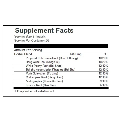 Women's Treasure (Ba Zhen Wan) Ingredients: Di Huang -shu (Rehmannia Root (Prepared)) Rehmannia glutinosa; Radix Praep. 18.20% Dang Gui (Chinese Angelica Root) Angelica sinensis; Radix 18.20% Bai Zhu (Bai-zhu Atractylodes Rhizome) Atractylodes macrocephala; Rhizoma 12.10% Bai Shao (Chinese White Peony Root) Paeonia lactiflora; Radix 12.10% Dang Shen (Codonopsis Root) Codonopsis spp.; Radix 12.10% Fu Ling (Poria; Hoelen; Tuckahoe) Poria cocos; Sclerotium 12.10% Chuan Xin Lian (Andrographis) Andrographis paniculata; Herba 9.10% Gan Cao (Licorice Root) Glycyrrhiza spp.; Radix 6.10%
