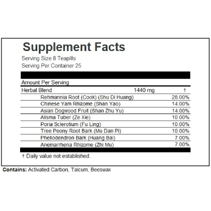 Di Huang -shu (Rehmannia Root (Prepared)) Rehmannia glutinosa; Radix Praep. 28.00% Shan Zhu Yu (Asiatic Dogwood Fruit) Cornus officinalis; Fructus 14.00% Huai Shan / Shan Yao (Chinese Yam) Dioscorea oppositiflora; Radix 14.00% Ze Xie (Asian Water Plantain Rhizome) Alismatis orientalis; Rhizoma 10.00% Mu Dan Pi (Tree Peony Root Bark) Paeonia suffruticosa; Cortex 10.00% Fu Ling (Poria; Hoelen; Tuckahoe) Poria cocos; Sclerotium 10.00% Huang Bai (Phellodendron Bark) Phellodendron spp.; Cortex 7.00% Zhi Mu (Anemarrhena) Anemarrhena asphodeloides; Rh. 7.00%