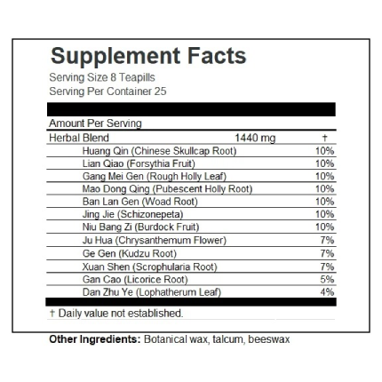 Huang Qin (Chinese skullcap root) 10%; Lian Qiao (forsythia fruit) 10%; Gang Mei Gen (rough holly leaf and root) 10%; Mao Dong Qing (Pubescent holly root) 10%; Ban Lan Gen (woad root) 10%; Jing Jie (schizonepeta) 10%; Niu Bang Zi (burdock root) 10%; Ju Hua (chrysanthemum flower) 7%; Ge Gen (kudzu root) 7%; Xuan Shen (scrophularia root) 7%; Gan Cao (licorice root) 5%; Dan Zhu Ye (Lophatherum leaf) 4%