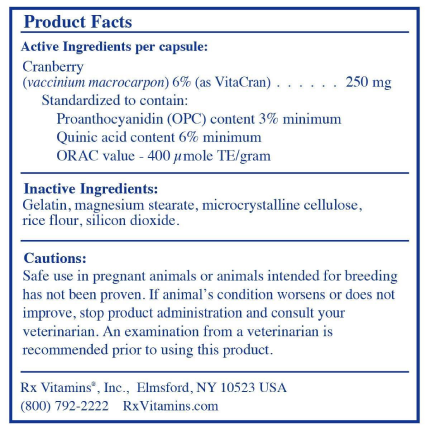 Cranberry Rx by Rx Vitamins for Pets provides 250 mg of a North American grown, high-potency, cranberry juice concentrate that has been standardized to contain a minimum of 3% oligomeric proanthocyanidin content (OPC) and a minimum of 6% quinic acid.